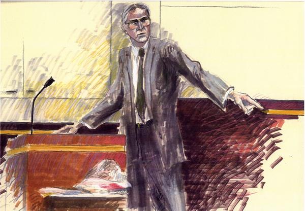 During the time I was freelancing as a courtroom artist, I had the opportunity to draw figures in a variety of dramatic poses. This lawyer was delivering his impassioned closing at the end of a murder trial.